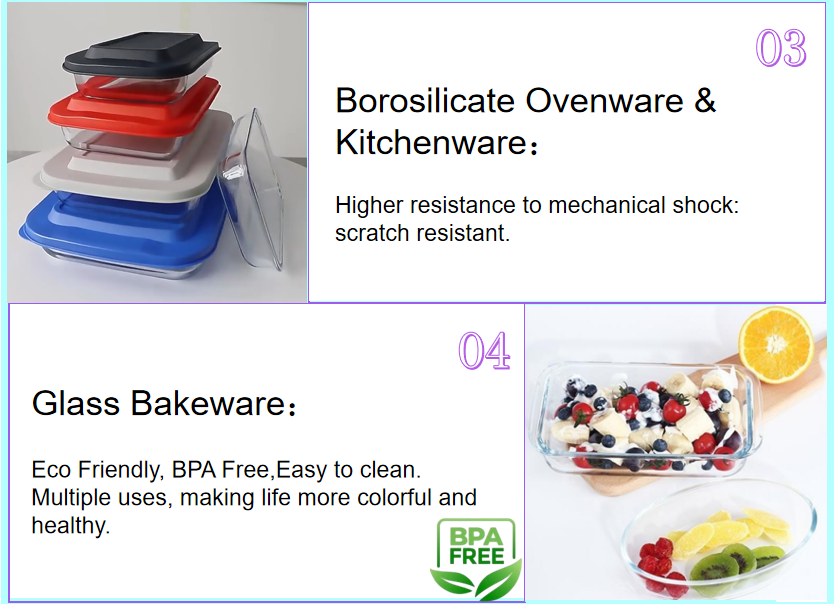 1.Made of shatter-resistant and tempered high borosilicate glass 2.Safe to use in freezer, dishwasher, microwave and oven (do not put lids in oven or microwave) 3.Containers nest/stack to save space 4.Won't absorb odors and stains